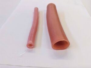 また、吻合不全の有無を確認するためにリークテストを実施されたいとのご要望に沿い、吻合する側とは逆側にシリンジの差し込み口を設けて水を注入できる仕様を採用しました。腸管は、位置によってサイズが異なるため、2サイズご用意。肛門側の直径6㎜と口側の直径15㎜のモデルを製作しました。