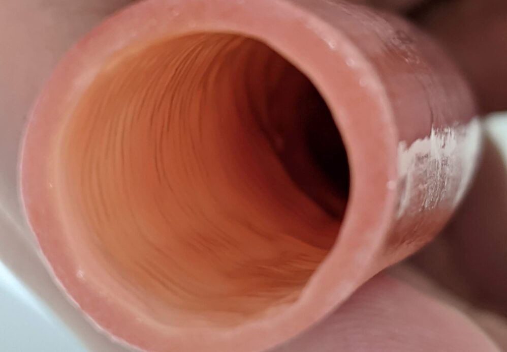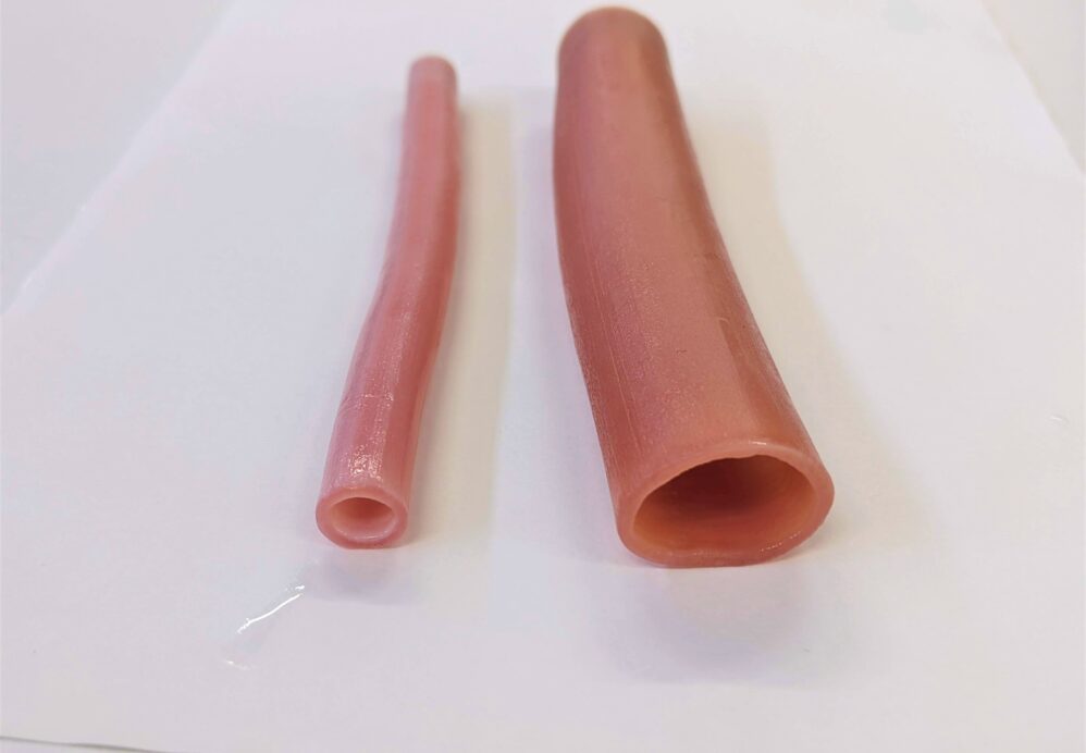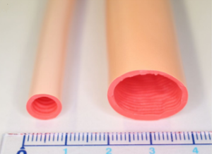 腸管モデルを開発するにあたり、素材の異なるモデルを試作し、それぞれの評価結果を確認しながら妥当性の高いモデルを採用されたいとのことで、2種類の素材と工法で製作しました。一方は、ウェットタイプの特殊なインク剤を用いて専用の3Dプリンターで製作。もう一方は、ドライタイプの軟らかいウレタンを用いて成形した腸管を赤色に着色し、その外側をピンク色の塗料で厚く覆うことにより二層構造としました。