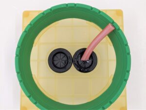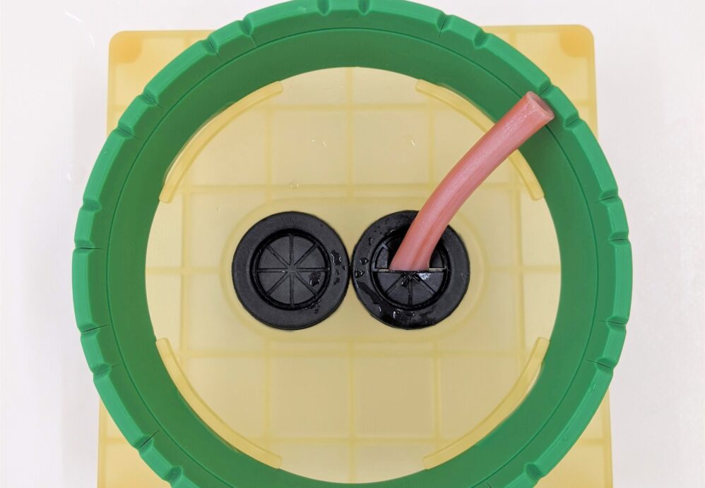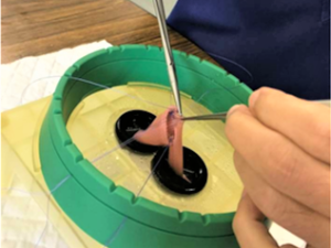 吻合トレーニングでは、腸管モデルを固定する必要があります。今回は、市販されているゴム製ブッシングの任意のスリットに切り込みを入れ、トレーニング中に腸管が動かないよう固定する方法をご提案しました。