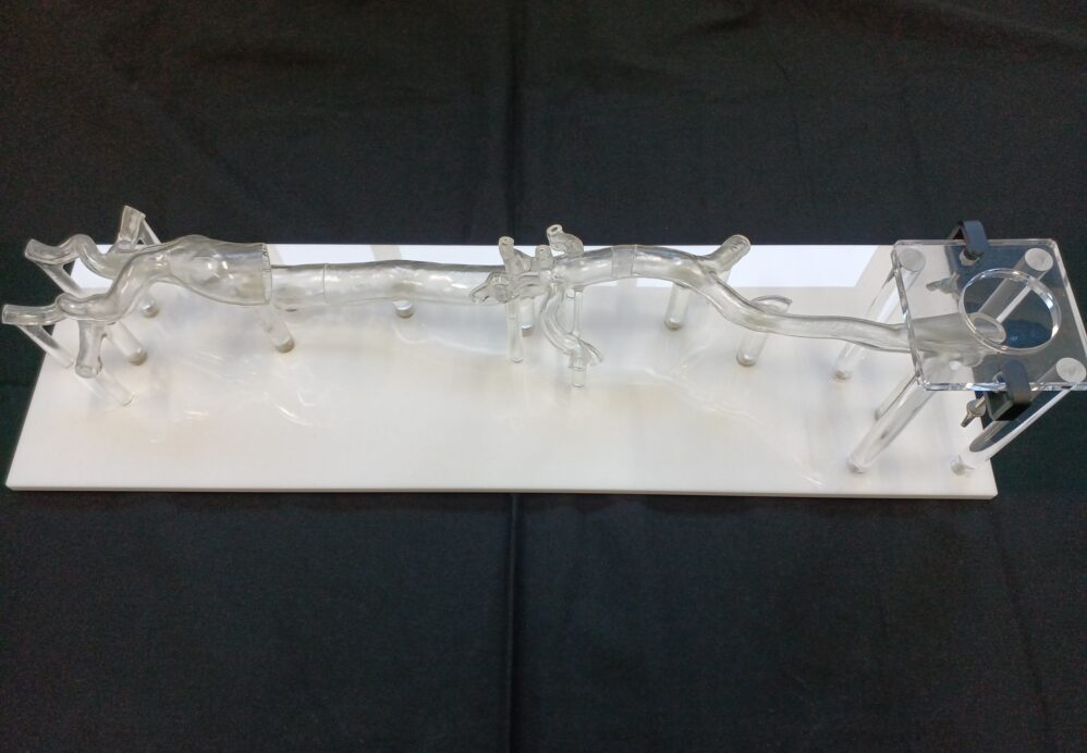 血管走行を臨床に即したものとするため、先生よりご支給いただいたCTデータをベースに設計しました。使用目的(腎動脈・腹腔動脈・総頚動脈へのカテーテルアプローチ、及び、シース挿入手順の確認)に応じて必要最小限の表現範囲とし、水や疑似血液などを使用しないドライな環境下でも簡便にご使用いただけるよう、硬質透明樹脂で製作しました。穿刺部に市販の塩ビシートを活用することで、ランニングコストを抑えたご提案をさせていただきました。が浮き上がるよう製作しました。