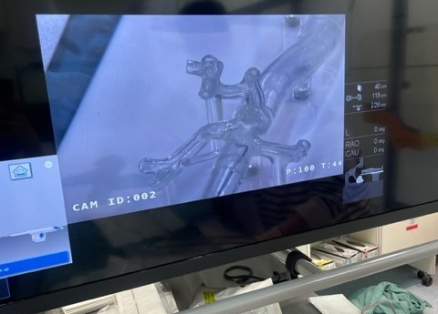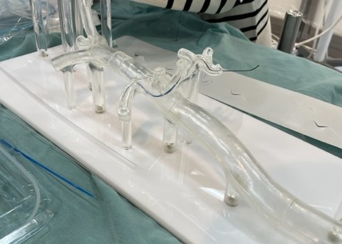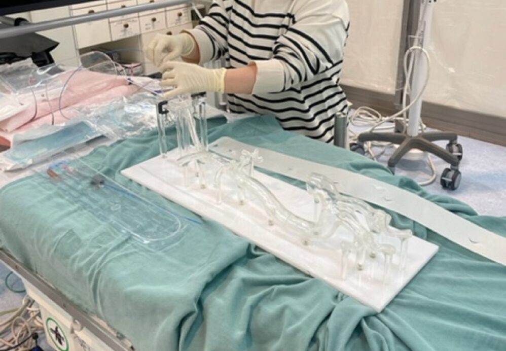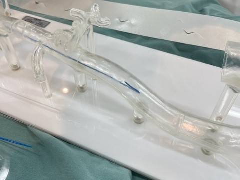 現在の臨床現場においてIVRの担う役割は年々大きくなり、IVR医の教育は非常に重要です。近年ではトレーニング用の血管モデルやシミュレーターも普及しつつあり、実践的な教育に有効ですが、そのような備品はスキルスラボ等のトレーニング専用の部署に設置されている施設が多いと思います。今回の血管モデルを制作依頼した目的は、現場で医学部生や若手医師が実際のIVRを見学した際に、血管造影室あるいはその近くの机上にすぐにモデルを出して、臨床の印象が薄れないうちにカテーテル操作を実践するといったシームレスな教育をイメージし、簡易的で可搬性に優れたものを作ることでした。本モデルは硬質素材で弾性はありませんが滑りは良く、内腔を潤滑剤や液体で満たす必要はありません。カテーテルの大動脈1-2分枝への誘導のトレーニングに有効に利用できています。また簡易的な分、コンパクト且つ軽量です。さらにシース挿入部は開口部をシートで覆い、穿刺・シース挿入から行うことができます。シートは自前で安価な塩ビシートであるため、穿刺で破損が進んでも安価に手に入れて自分で交換することができます。使用感には非常に満足しています。