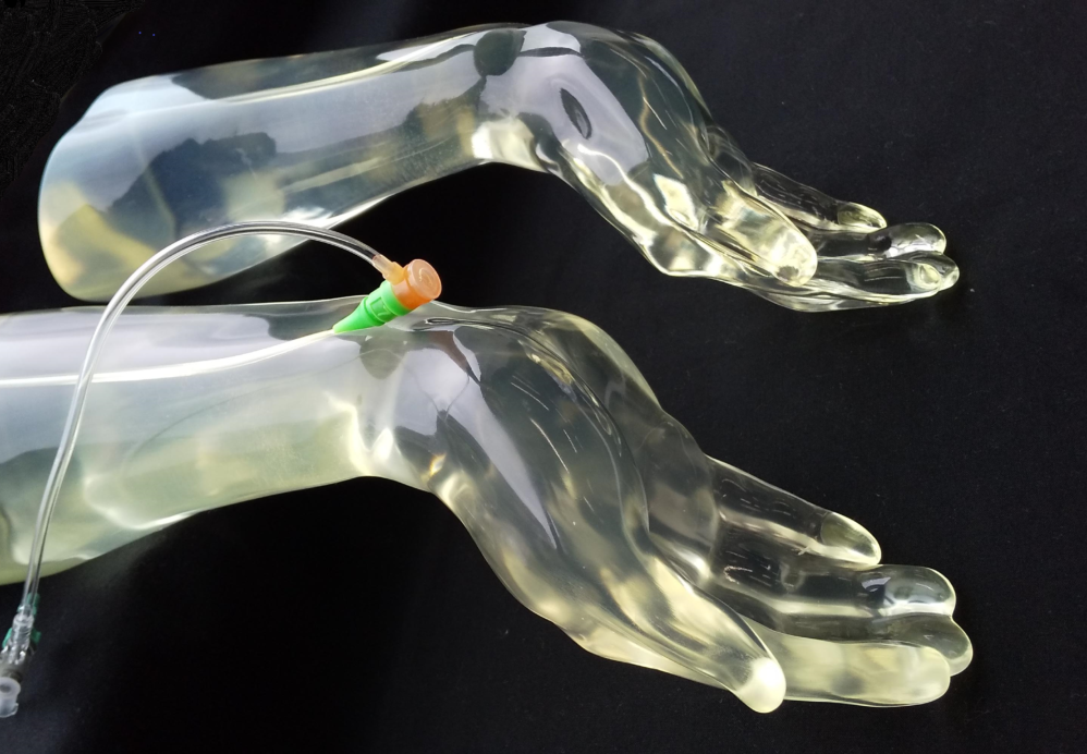 テルモ株式会社様の研修施設であるテルモメディカルプラネックス様よりご依頼いただき、カテーテル治療に使用するシース※および止血バンドを展示するための2体の手首モデルを製作しました。