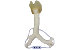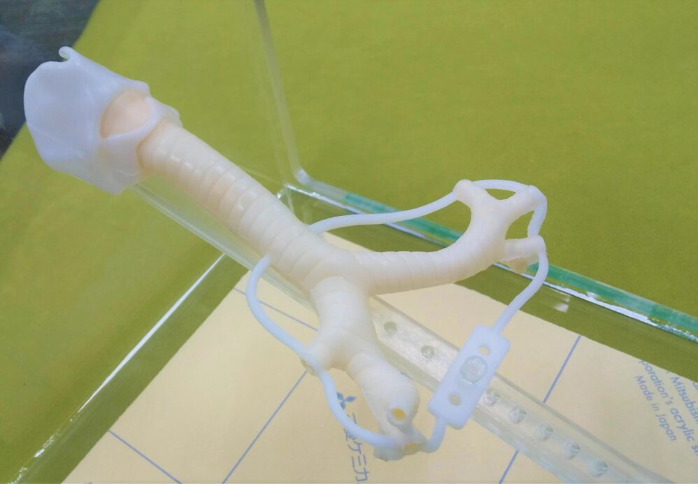 気管は、馬蹄形の軟骨部と、膜様部と呼ばれる筋繊維に富む膜部分から構成されています。この異なる2つの組織を表現し、かつ切除や縫合ができるよう、選定する材料に幅がある真空注型を採用。各組織に対応する2種の樹脂の選定とそれぞれの硬度調整を繰り返しながら試作を進め、弾力のある軟骨部と軟らかく伸縮性のある膜様部を表現しました。当研究では、実際に再建術を行なった術者が、気管支モデルを用いてその手技を再現できることも確認されました。
