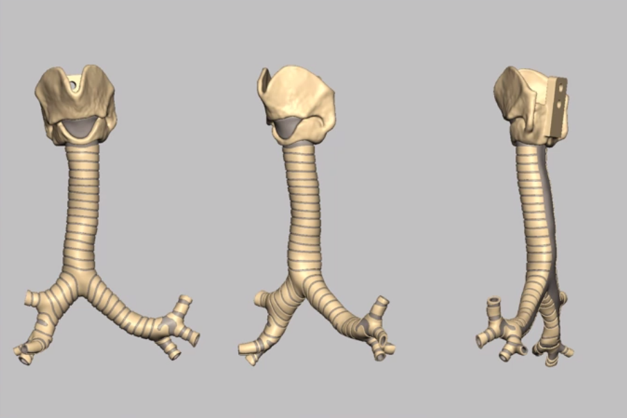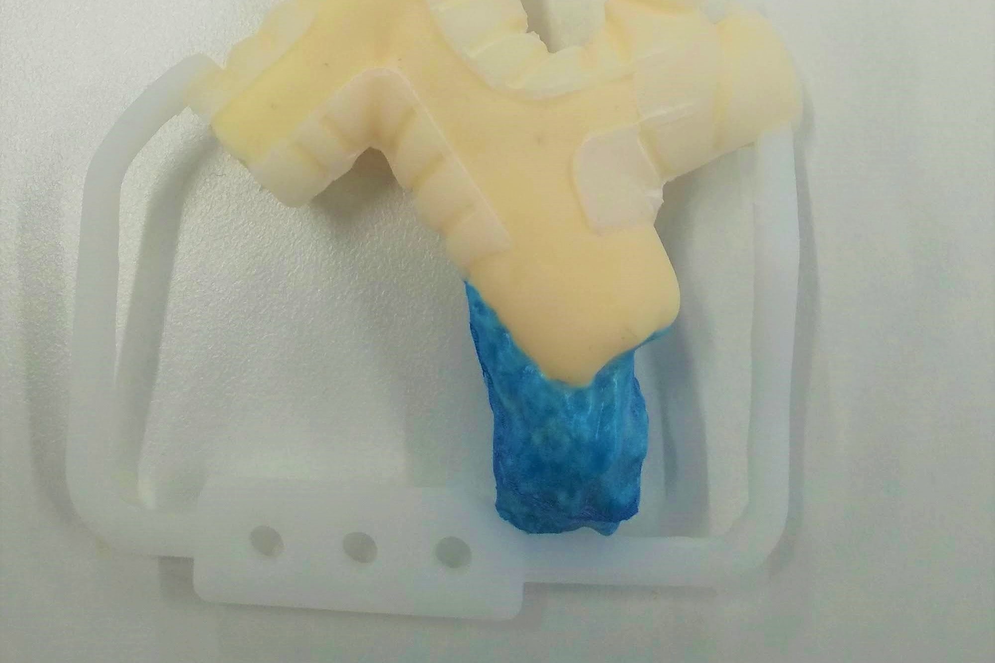 気管は、馬蹄形の軟骨部と、膜様部と呼ばれる筋繊維に富む膜部分から構成されています。この異なる2つの組織を表現し、かつ切除や縫合ができるよう、選定する材料に幅がある真空注型を採用。各組織に対応する2種の樹脂の選定とそれぞれの硬度調整を繰り返しながら試作を進め、弾力のある軟骨部と軟らかく伸縮性のある膜様部を表現しました。当研究では、実際に再建術を行なった術者が、気管支モデルを用いてその手技を再現できることも確認されました。