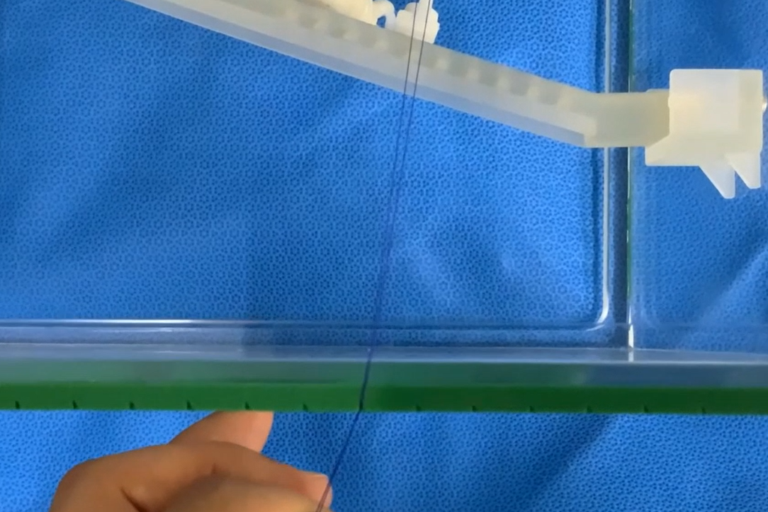 今回は、より実践的に手技トレーニングを行なえるよう、術野を模した専用什器も製作しました。什器内には、仰臥位や横臥位での気管支の角度と位置になるよう固定具を設置。什器の周囲に取り付けたスリット入りの縁取りが縫合糸の整理と保持を可能とし、視野をしっかりと確保します。また、気管支モデルを取り換えれば、手技の習得に必要な反復練習を行なうことが可能です。