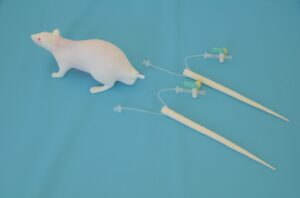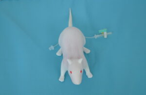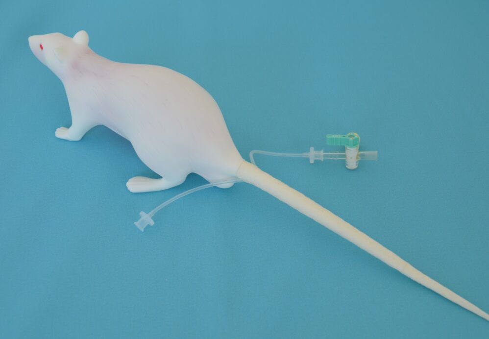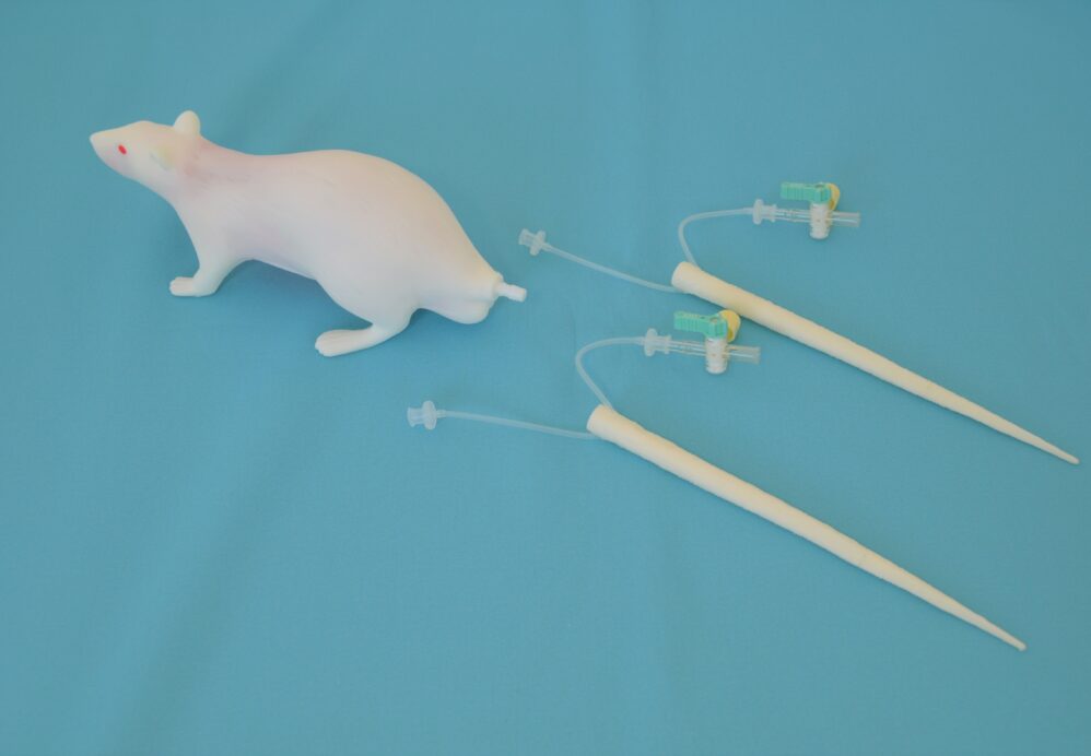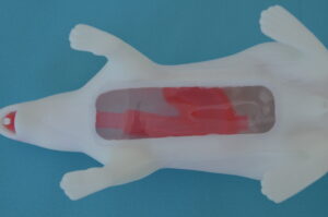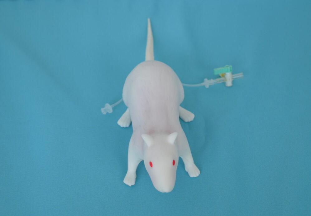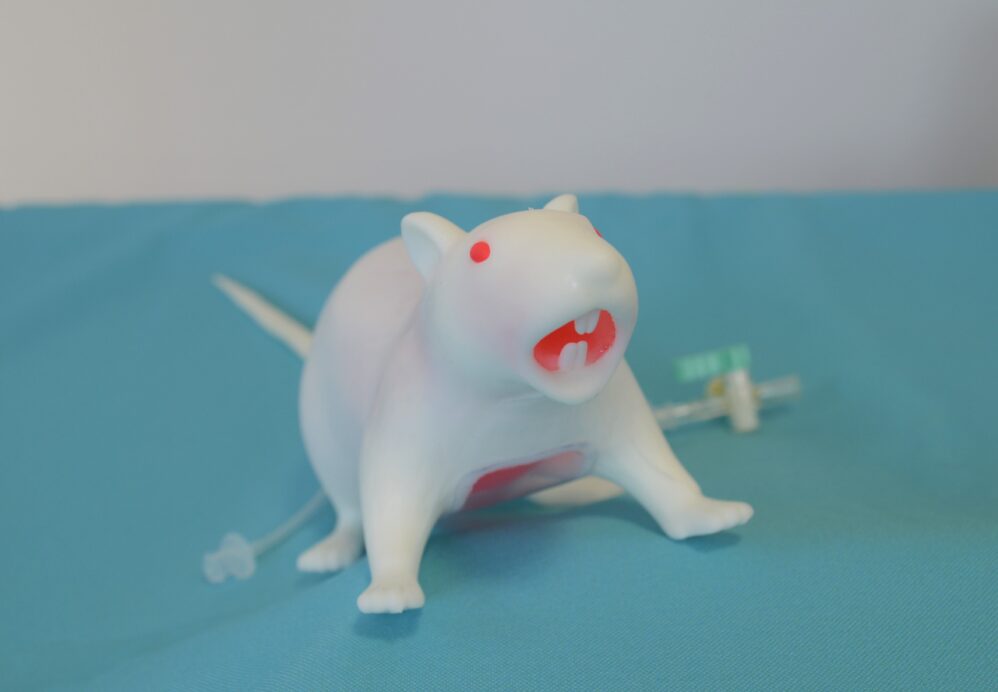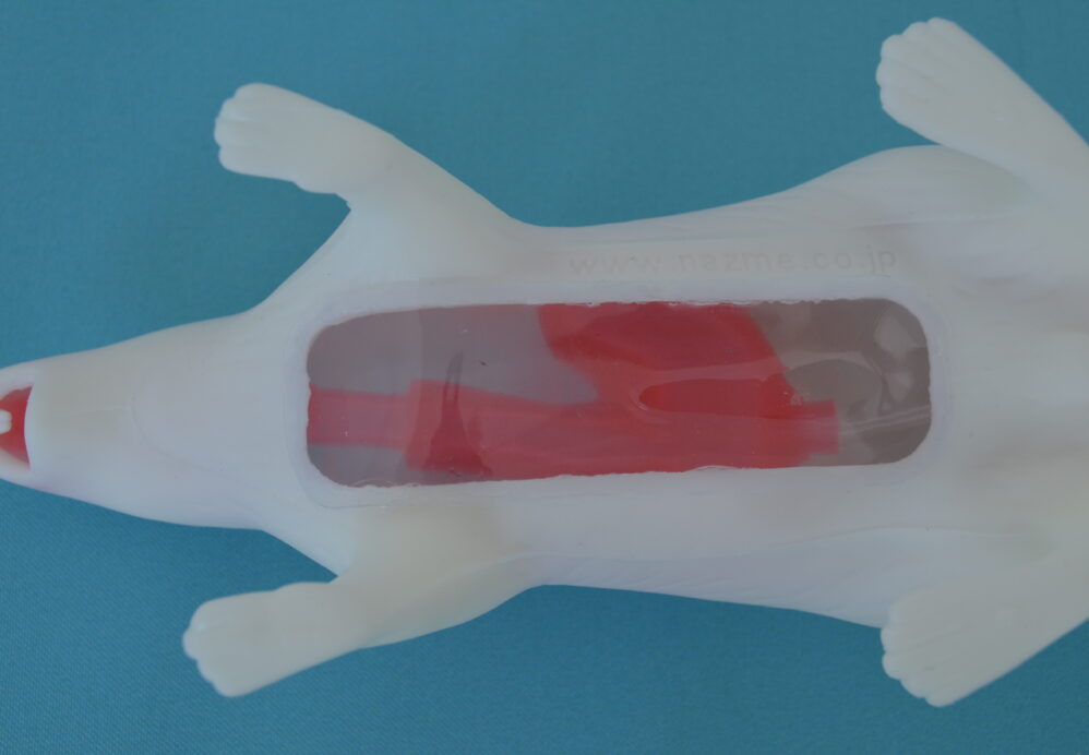 また、口から薬などを投与する際に、投与針の挿入を効率よくトレーニングするため、気管や食道、胃に挿入された針の位置を確認できるよう、腹部の一部に透明の樹脂を採用しています。新ナツメラットでは正しい操作をトレーニングすることにより実験動物の苦痛を軽減できるだけではなく、誤って気管に投与針が入る様を実際に見せながら教えることができるという点においても、生体の代替モデルとして大きな意義があるといえます。