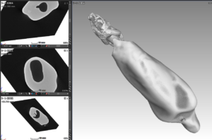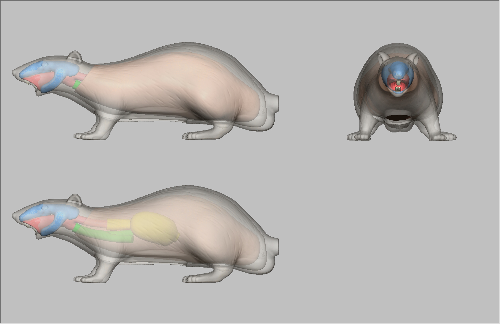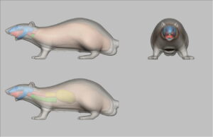 例えば、生体が動かないようしっかりと抑えておく『保定』では実験者の5本の指すべてを使って背中の皮膚をたくし込むように大きくつまみます。正しい保定方法を習得するためには、ラットの皮膚感触に近づけることが非常に重要で、その決め手となるのが腹部パーツの軟らかさと、表皮と内臓パーツの空間でした。そこで、腹部パーツ用に新たな軟質の樹脂を採用した上で、目に見えない内部空間の形状をCTスキャンにより3Dデータに反映させることで、求めていた感触を再現しています。