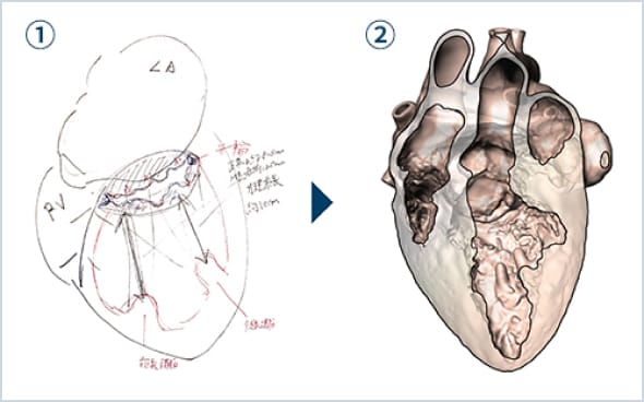 ②イラストとCTデータを基に僧帽弁の弁尖形状を再現
