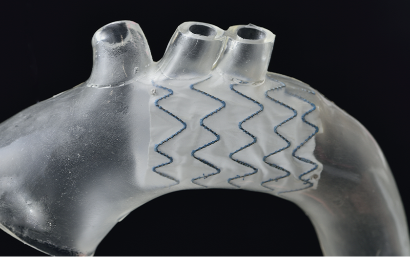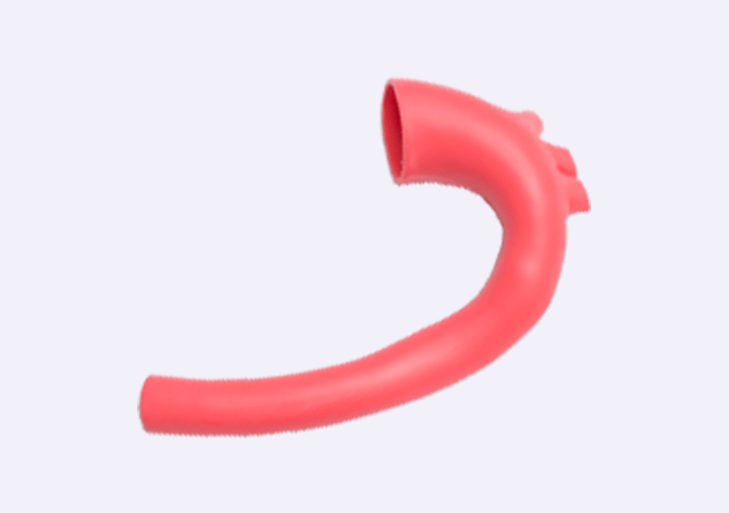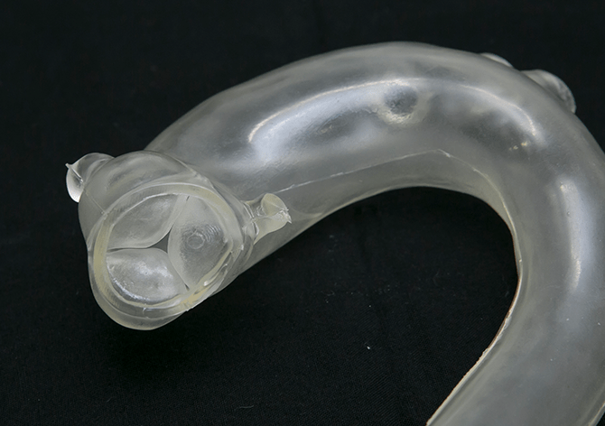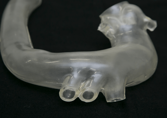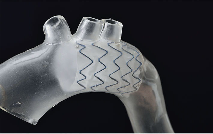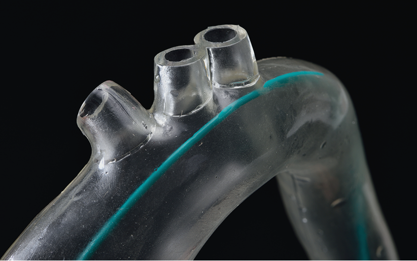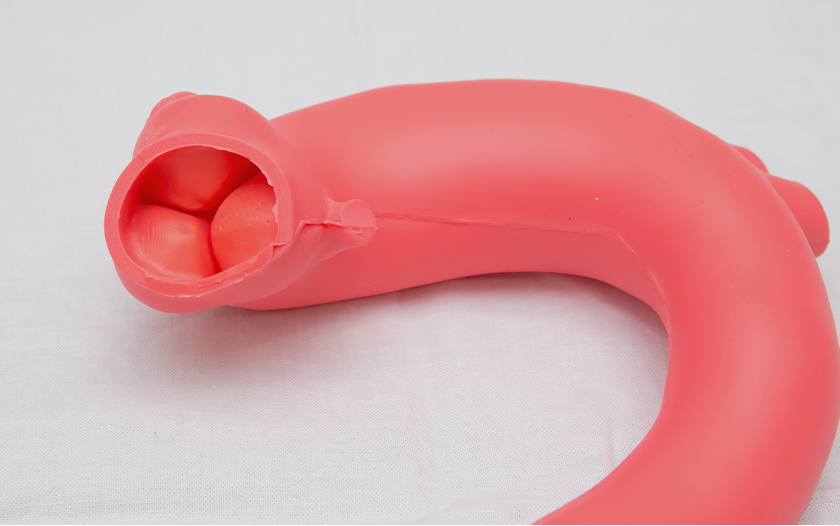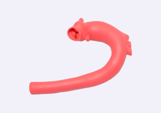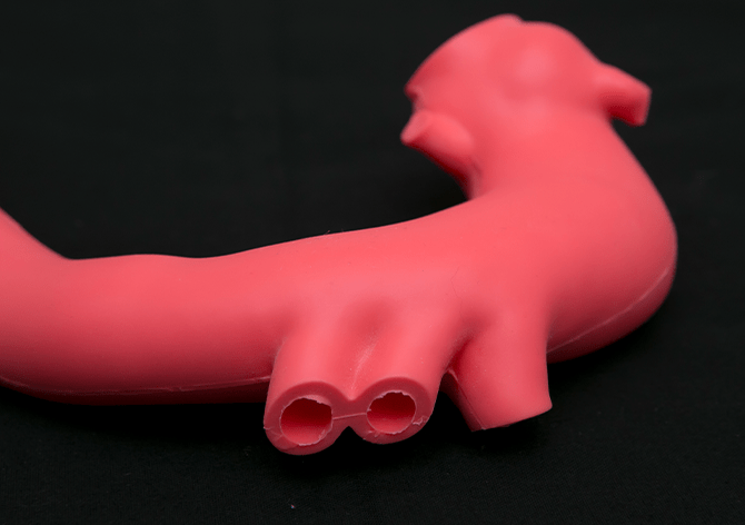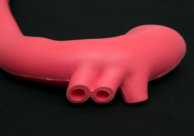 胸部大血管に特化したモデル大動脈弓モデルは、医師や医療機器メーカー様からのご要望により、製品化されたモデルです。胸部大血管のみを表現しており、大動脈弁と冠動脈入口部との位置関係や、弓部三分枝の分岐をご確認いただけます。血管内は空洞のため、カテーテルやステントグラフトなどの医療機器を挿入することが可能です。
