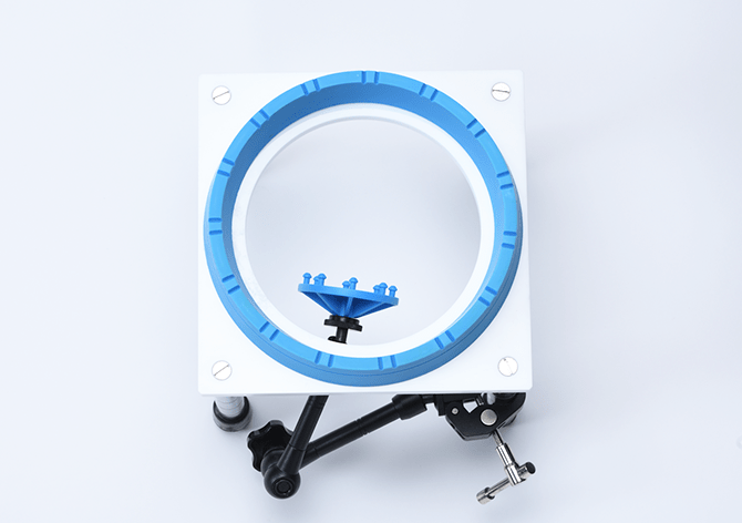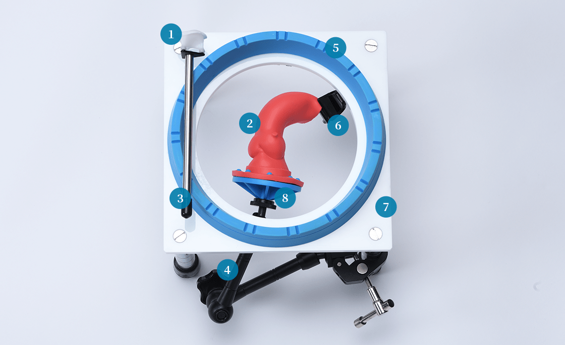容易にトレーニングを専用スタンドに大動脈基部モデルを取り付け、弓部側をクリップで留めて使用。フレキシブルアームで自由に大動脈の位置や角度を調整可能です。
