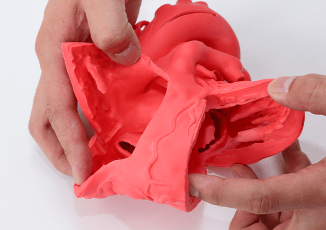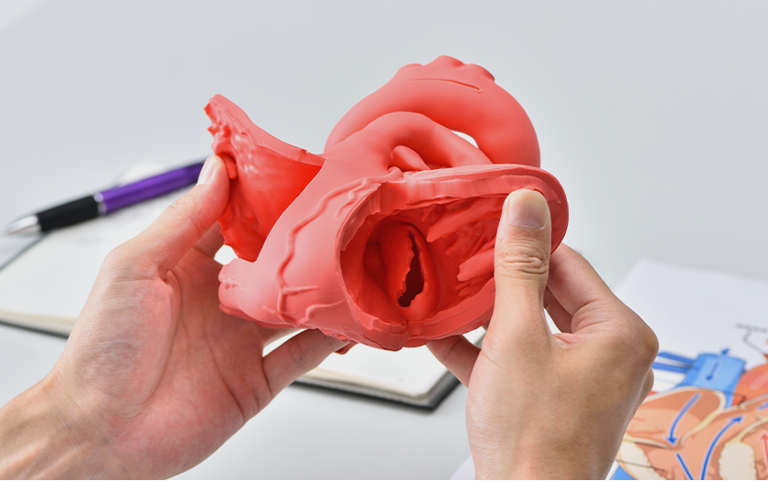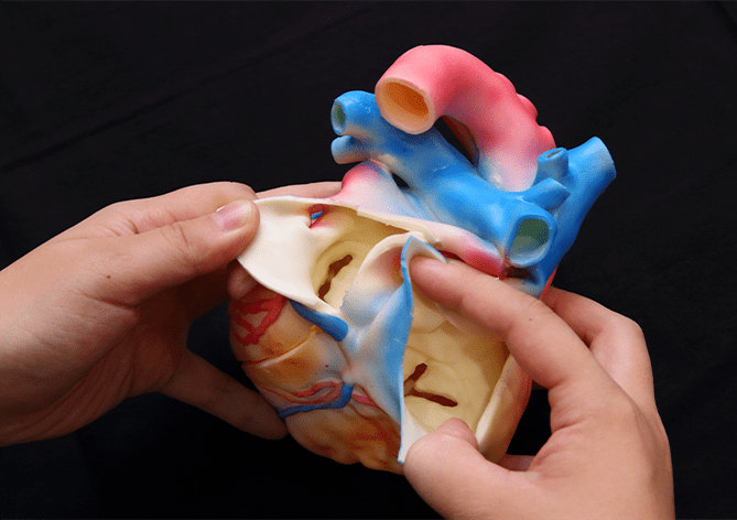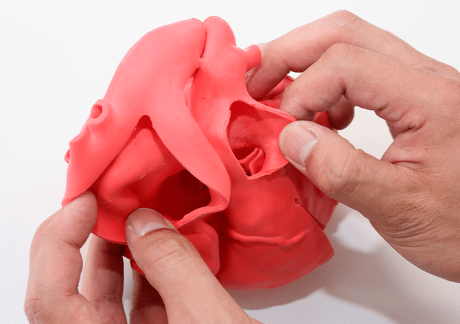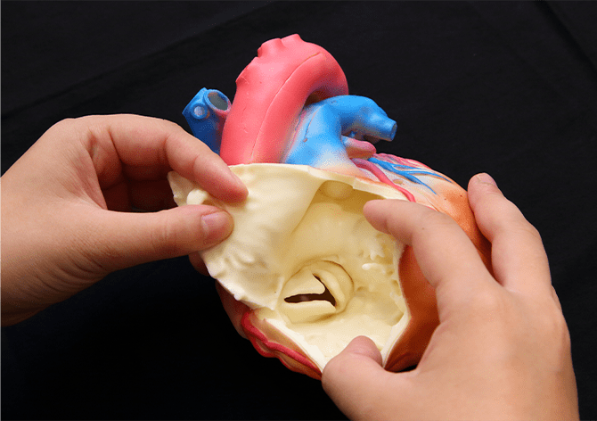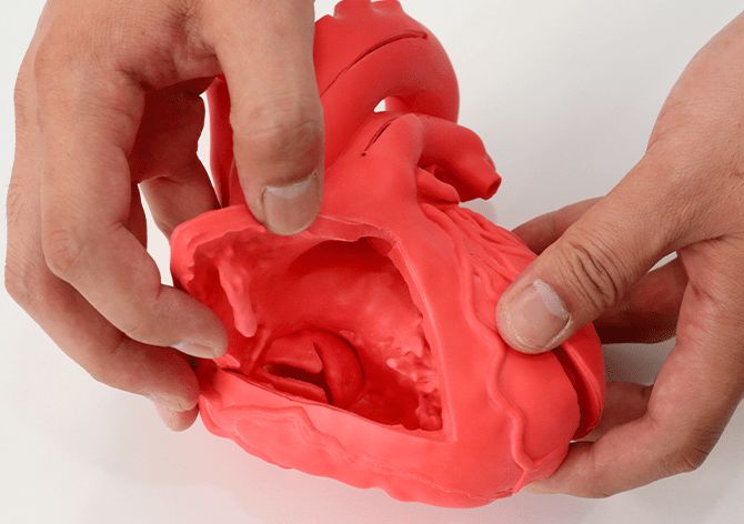 解剖理解をより容易にサポート成人正常心モデルとは異なり、Cardio Model E.V.には6か所のカットを入れています。カットがあることにより、心臓内の構造や4つの弁の位置関係を様々な角度から観察可能。教科書などではイメージしづらい心臓の三次元構造を頭の中で構築し、解剖理解にお役立ていただけます。