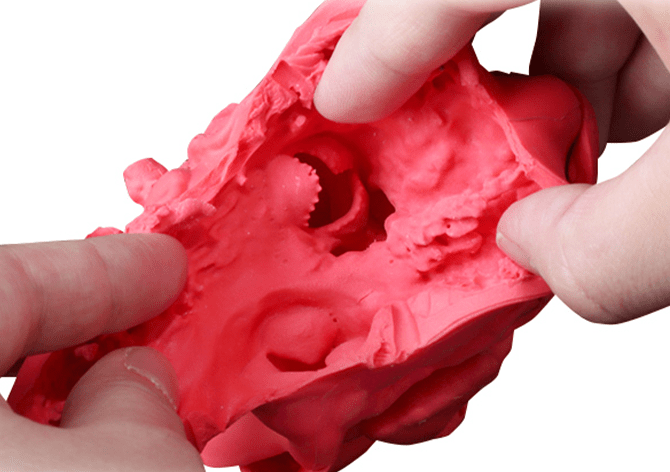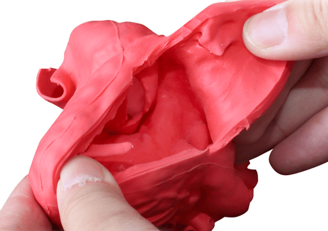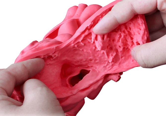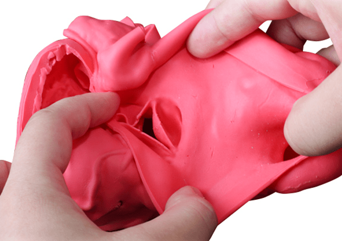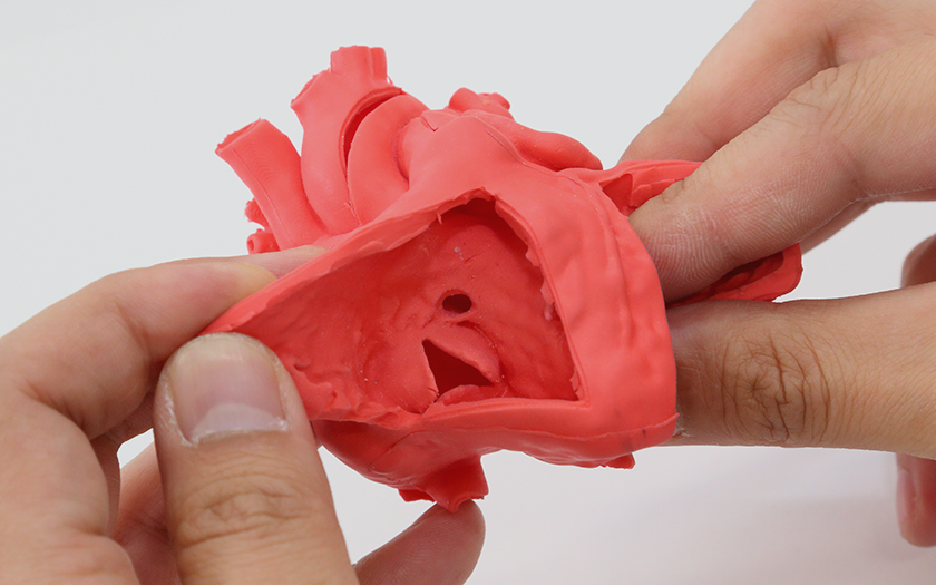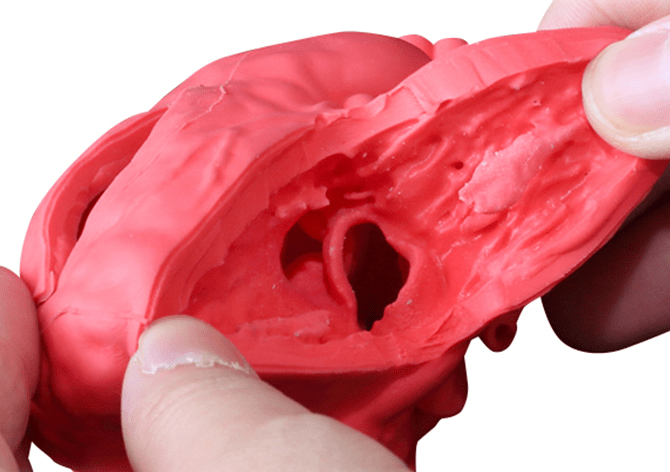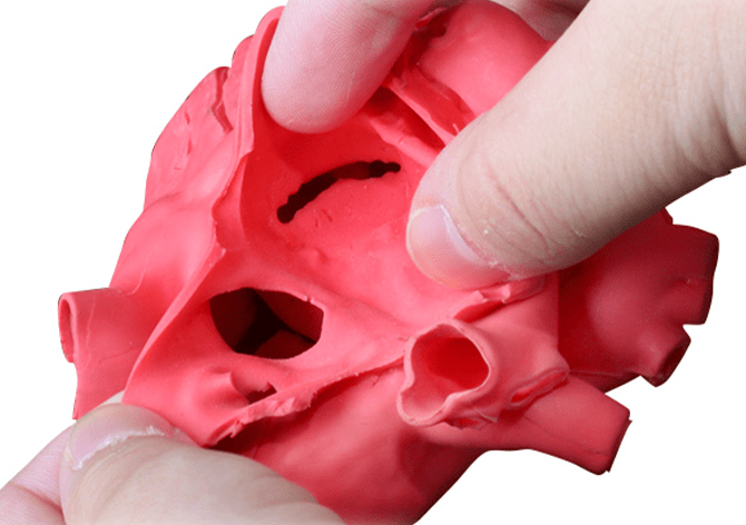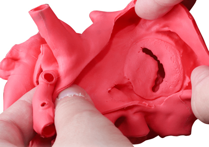 仕様を採用当モデルは、軟らかい素材を採用。また、医学的見地をもとに、疾患についてより理解を深めるためのカットを入れており、心臓内部を様々な角度から観察することが可能です。教科書などではイメージしづらい先天性小児心疾患の三次元構造の理解促進をサポートします。ご自身で任意の箇所に切り込みを入れられるノンカットタイプモデルもご用意しています。