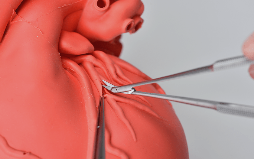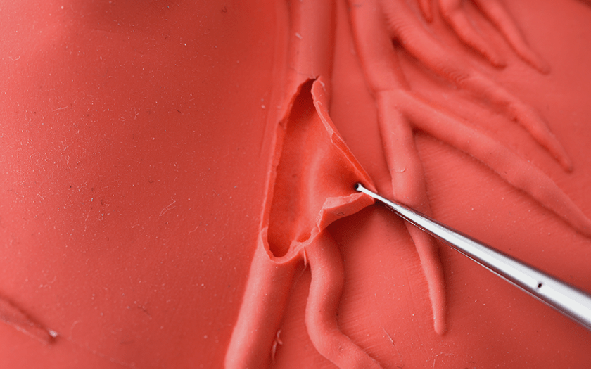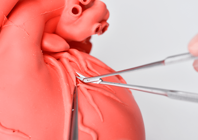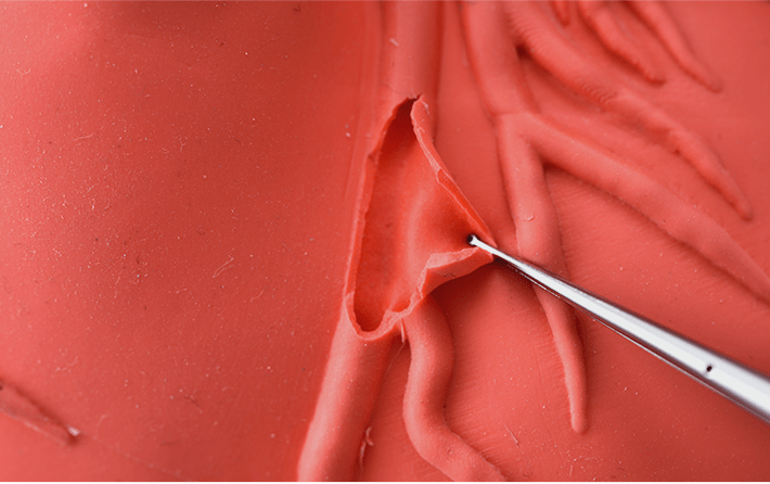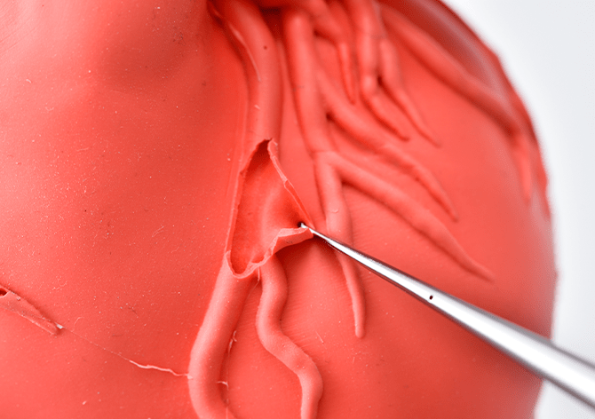 カテーテルなどの挿入が可能成⼈正常心モデルは、冠動静脈の内腔が空洞のため、冠動脈にカテーテルなどを挿入することが可能です。透明モデルは目視下で血管内における挙動を確認できるため、カテーテルなどの実証実験や若手医師の手技トレーニングにご活用いただけます。