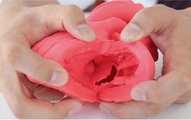 質感と内部組織を実現実際にメスで切開したり、開口部を開いて内部を観察できるのは軟質樹脂ならでは。なかでも軟質精密ウェットモデルは、実際の組織の質感に極めて近いインク剤を採用し、より精度の高い内部組織を再現しました。当社では、仕様に適した樹脂を選定し、ご要望に応じたモデルを製作します。