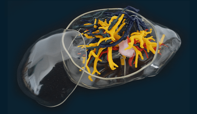 - 肝臓の腫瘍を様々な角度から確認したいため、腫瘍以外の部位は透明樹脂で製作したい。