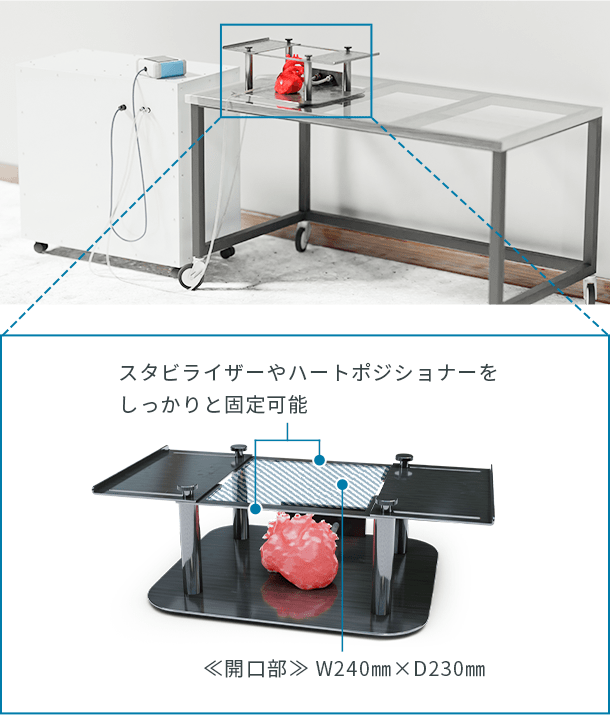 拍動装置と開胸器、専用の心臓モデルで構成されており、